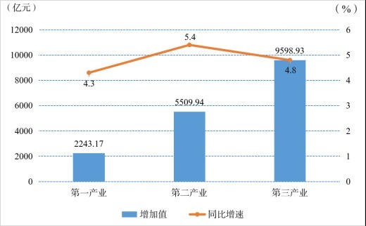 根据地区生产总值统一核算结果,前三季度贵州省地区生产总值17352.04亿元,按不变价格计算,同比增长4.9%。其中,第一产业增加值2243.17亿元,同比增长4.3%;第二产业增加值5509.94亿元,增长5.4%;第三产业增加值9598.93亿元,增长4.8%。