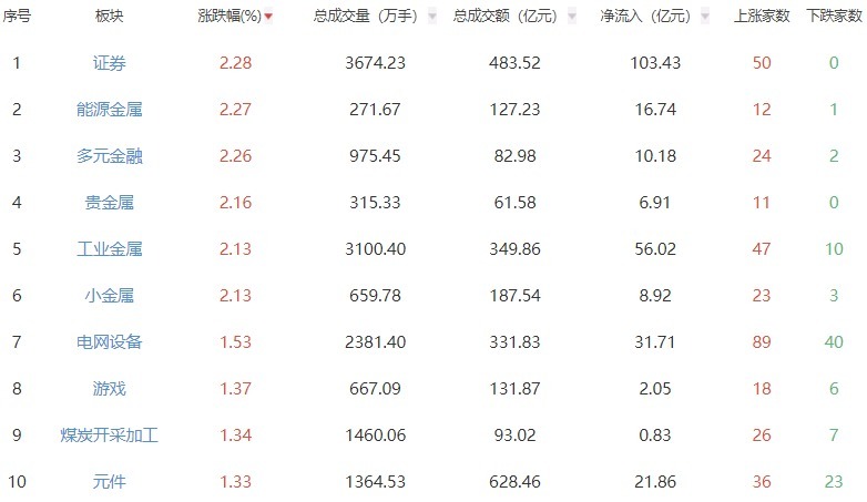 行业板块方面,证券、能源金属、多元金融、贵金属等板块涨幅居前,银行、汽车服务及其他、纺织制造、厨卫电器等板块下跌。